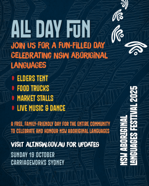 Join our free, family-friendly NSW Aboriginal Languages Festival on 19 October 2025 in Sydney in celebration of Aboriginal Languages and Culture.